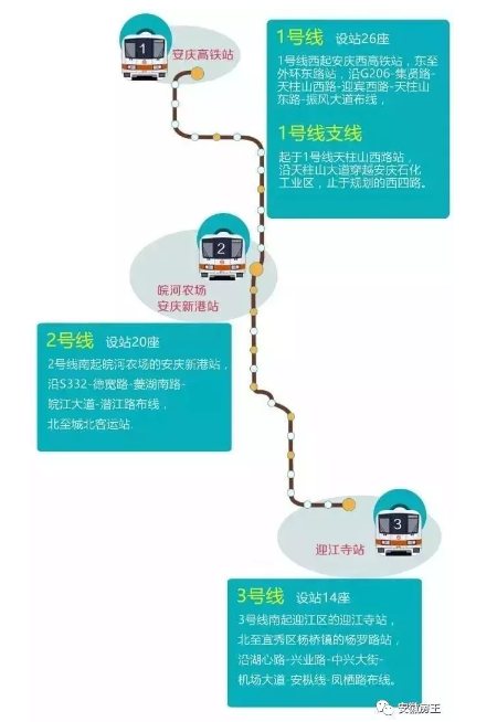 安庆地铁3号线:起自杨桥镇杨罗路,经凤栖路、安枞路、龙眠山路、中兴大街、菱湖北路、湖心路至终点迎江寺。