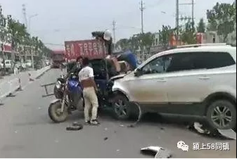 3日中午13时许,颍东区袁寨派出所门前,一轿车司机沿阜口路由西向东行驶时撞断路边护栏,护栏飞到路边。护栏被撞后表示自己很慌,更慌的是路中间骑摩托三轮车的驾驶员。小轿车撞完护栏后失控进入对向车道,再次撞上行驶中的三轮车。白色轿车前方有明显的撞击痕迹,幸运的是,三轮车上的人员都没事!