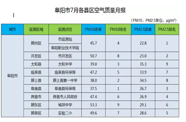 阜阳市2018年7月各县、区环境空气质量月报数据如下,按照PM10浓度排名最好的是阜南县、最差的是颍东区,按照PM2.5浓度排名最好的是颍州区、最差的是太和县。来源:市环保局编辑:阜小布